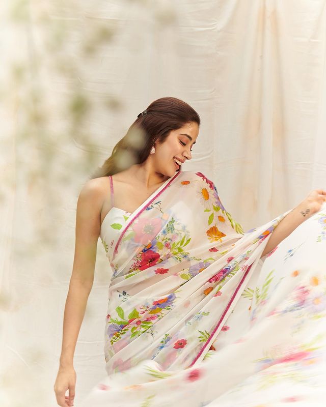 Not only does Kapoor shine in western outfits, but she also beautifully carries off floral prints in ethnic wear. Her strappy bustier dress adorned with floral motifs exudes a fresh spring look, while her radiant smile and sparkling fit enhance her beauty. Kapoor also donned a white floral-printed saree with a sweetheart neck strappy blouse, perfectly embodying Indian beauty.